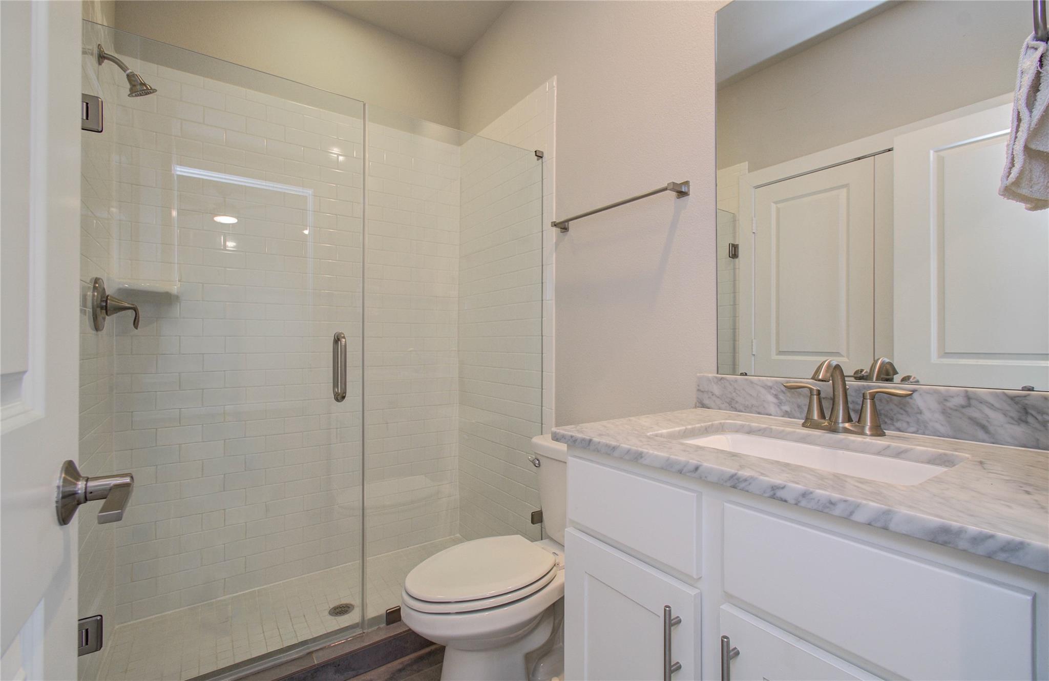 Upstairs, the primary suite feels warm and inviting with wood floors, a large closet, and a private bath. Another bedroom with its own bath is also on this level -- great for a roommate, office, or nursery.